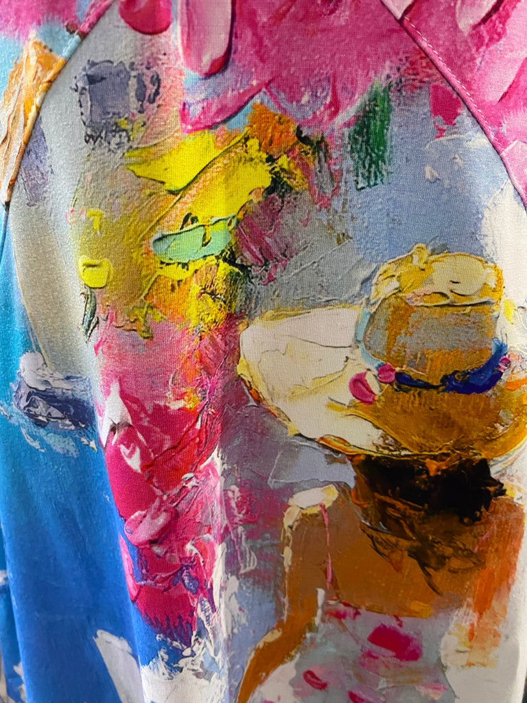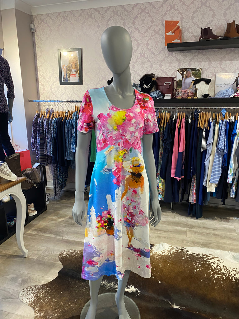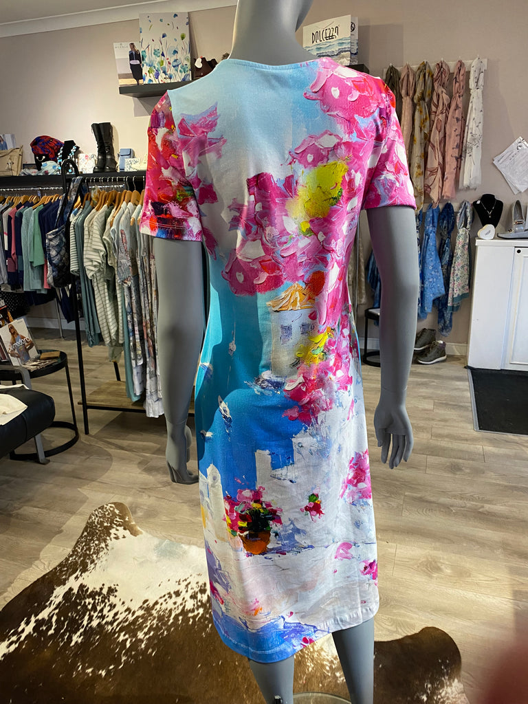 New arrival by Dolcezza is this stunning Dress designed by the artist Aziz Sulaymanov in 'Summer in Santorini' print. A short sleeve midi dress with a round neckline.