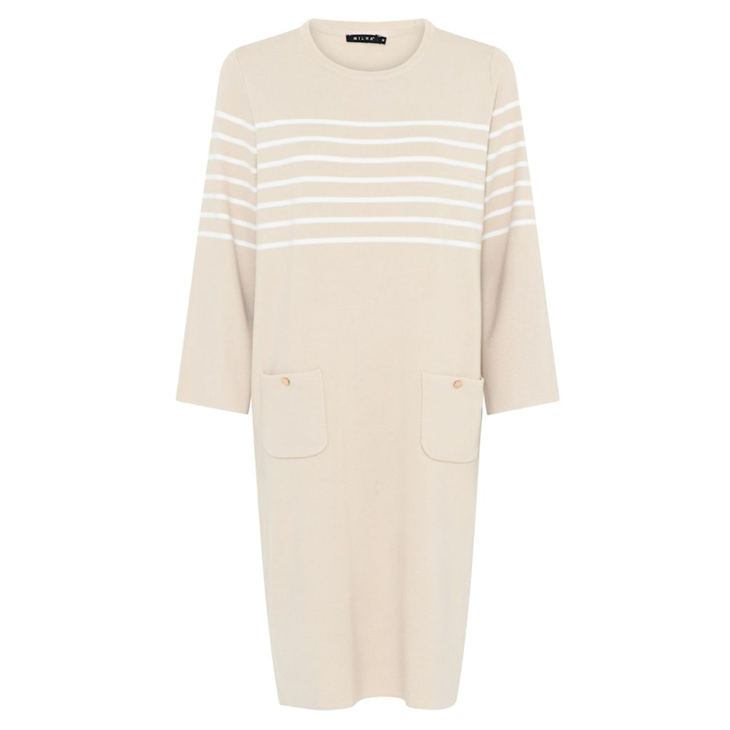 New arrival by Micha is this stylish Sand/offwhite Dress. A classic dress with a round neckline, long sleeves and white stripe detail.